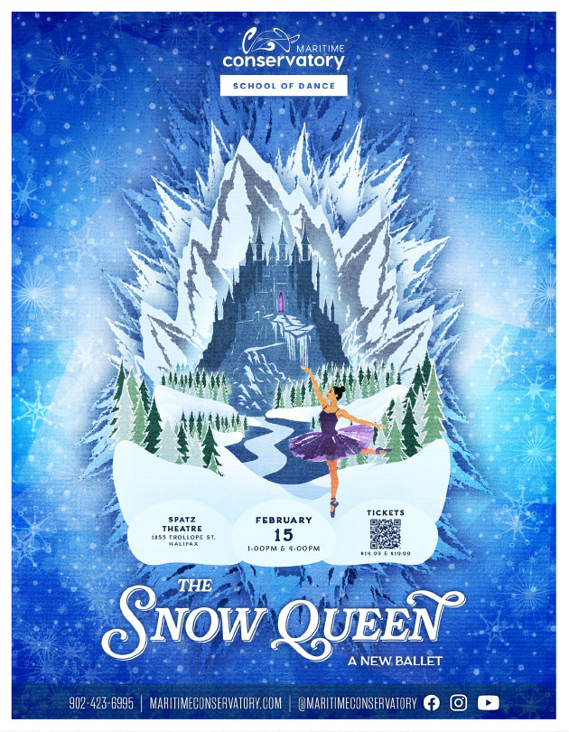 The Snow Queen: A New Ballet premieres February 15th, 2026. Shows at 1pm and 4pm at the Spatz Theatre, 1855 Trollope St, Halifax Based on the 1844 story by Hans Christian Andersen, this family friendly show is presented by students of the Maritime Conservatory School of Dance, featuring live music performed by students from the School of Music. What ages is the show suitable for? The show is suitable for audience members ages 3 years and over. We recommend that…